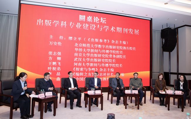 圆桌论坛环节以“出版学科专业建设与学术期刊发展”为主题,北京师范大学数字出版研究院执行院长、华侨大学新闻与传播学院院长万安伦,南京大学出版研究院常务副院长张志强,武汉大学出版研究院院长方卿,河南大学新闻传播学院院长王鹏飞,以及《探索与争鸣》杂志主编叶祝弟,《编辑之友》杂志社社长、主编李晶,《中国出版》执行主编李淼等7位嘉宾围绕出版学科建设、学术期刊在自主知识体系构建中的作用、产学研协同机制等话题展开思想碰撞。